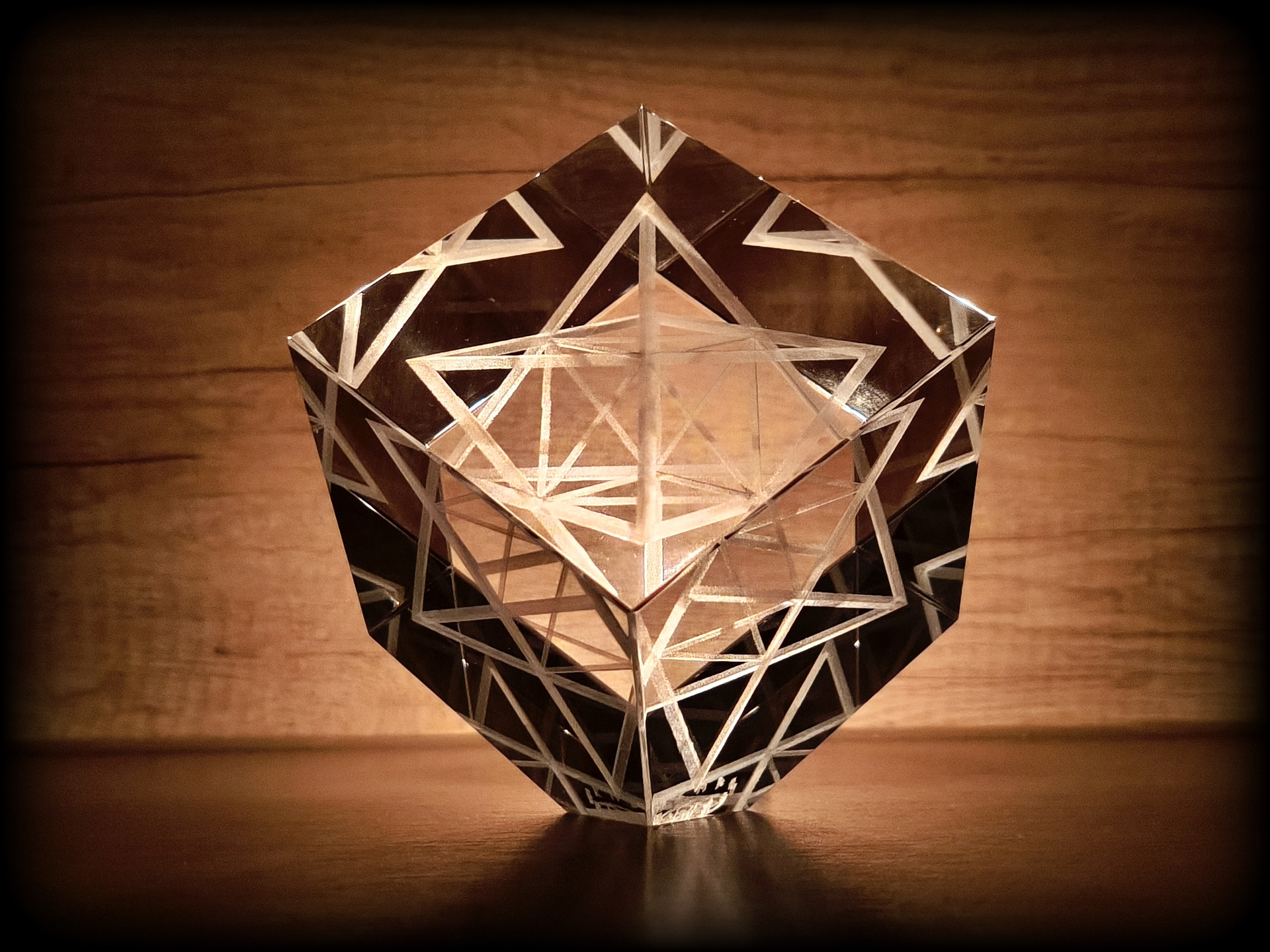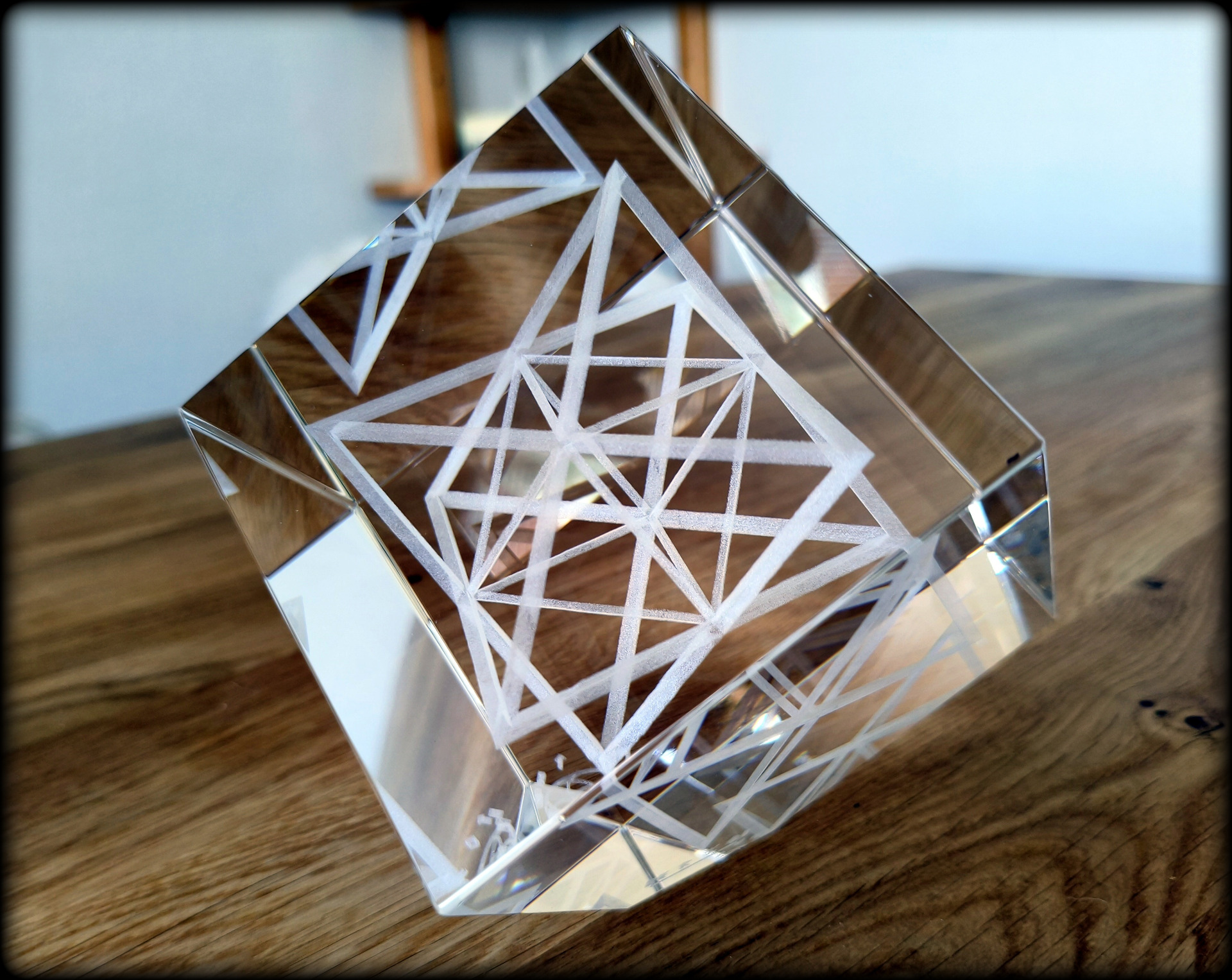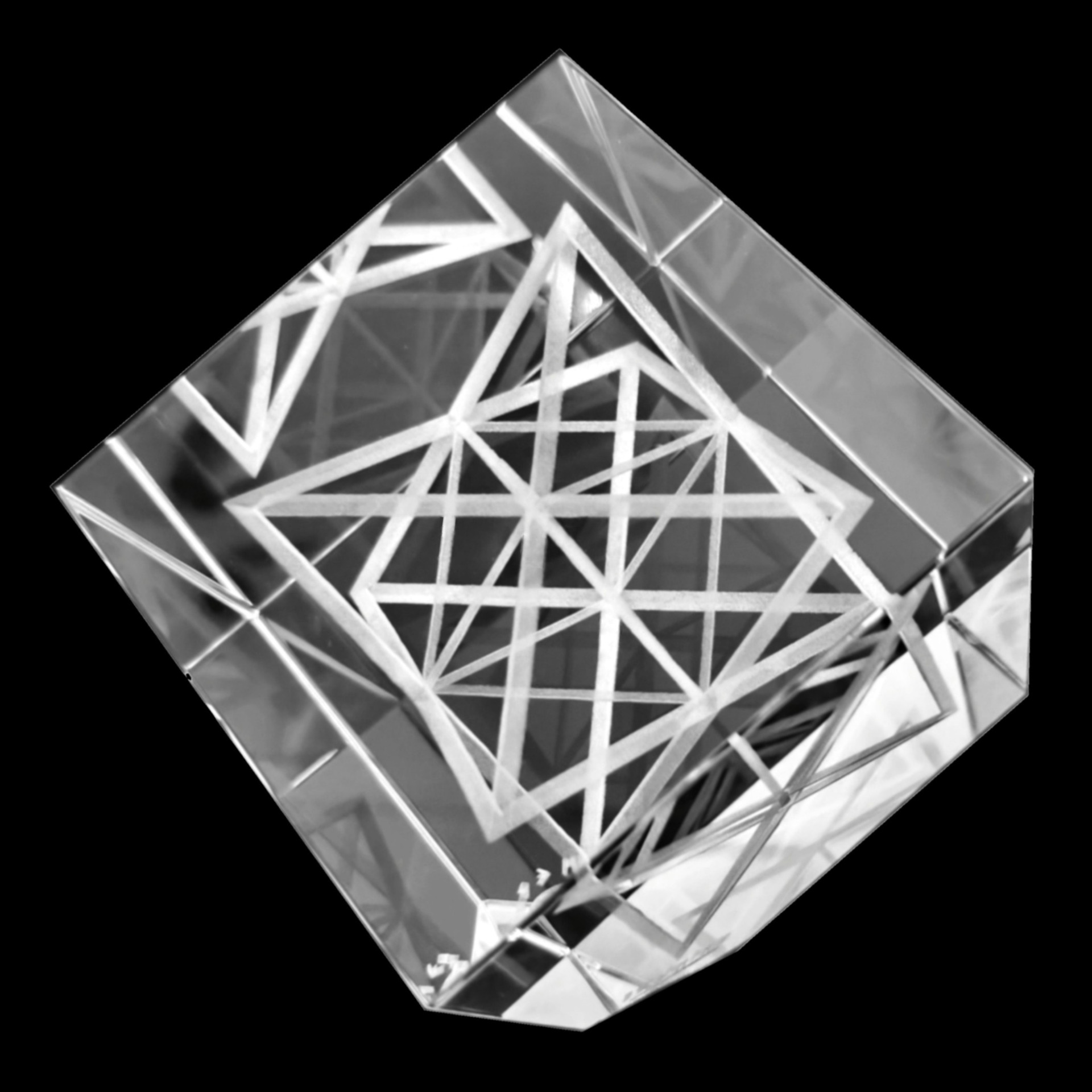 A luminous and mysteriously reflecting Merkaba inside a 9 cm x 9 cm x 9 cm cube. As if standing on the edge.