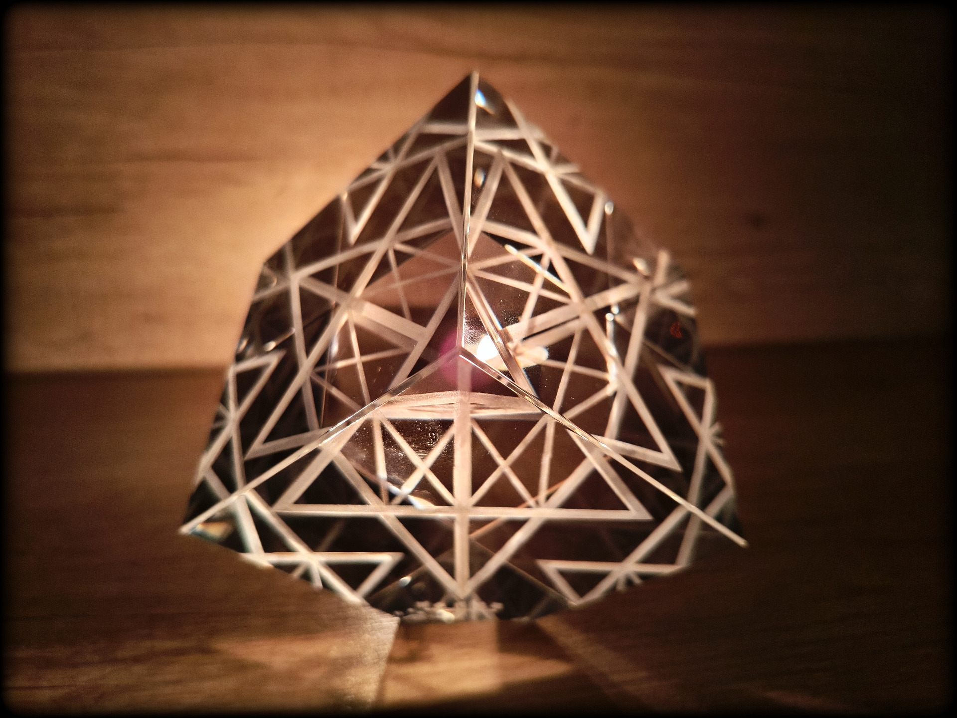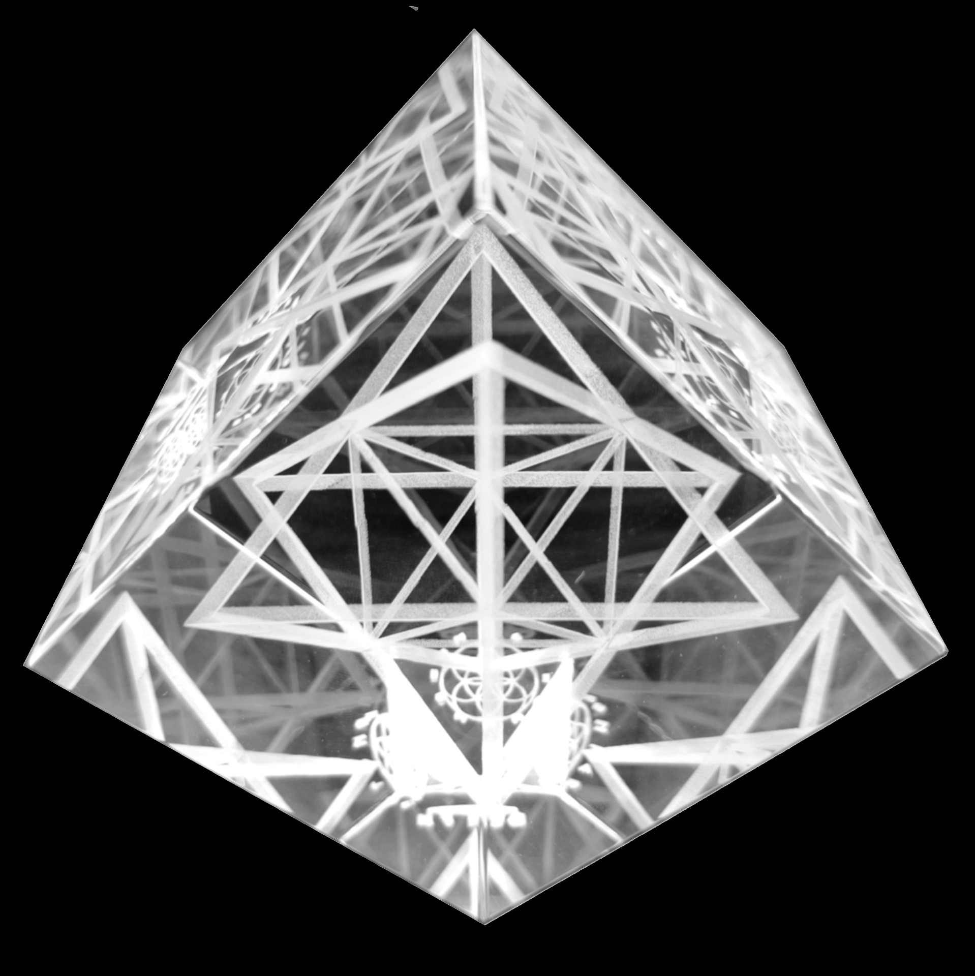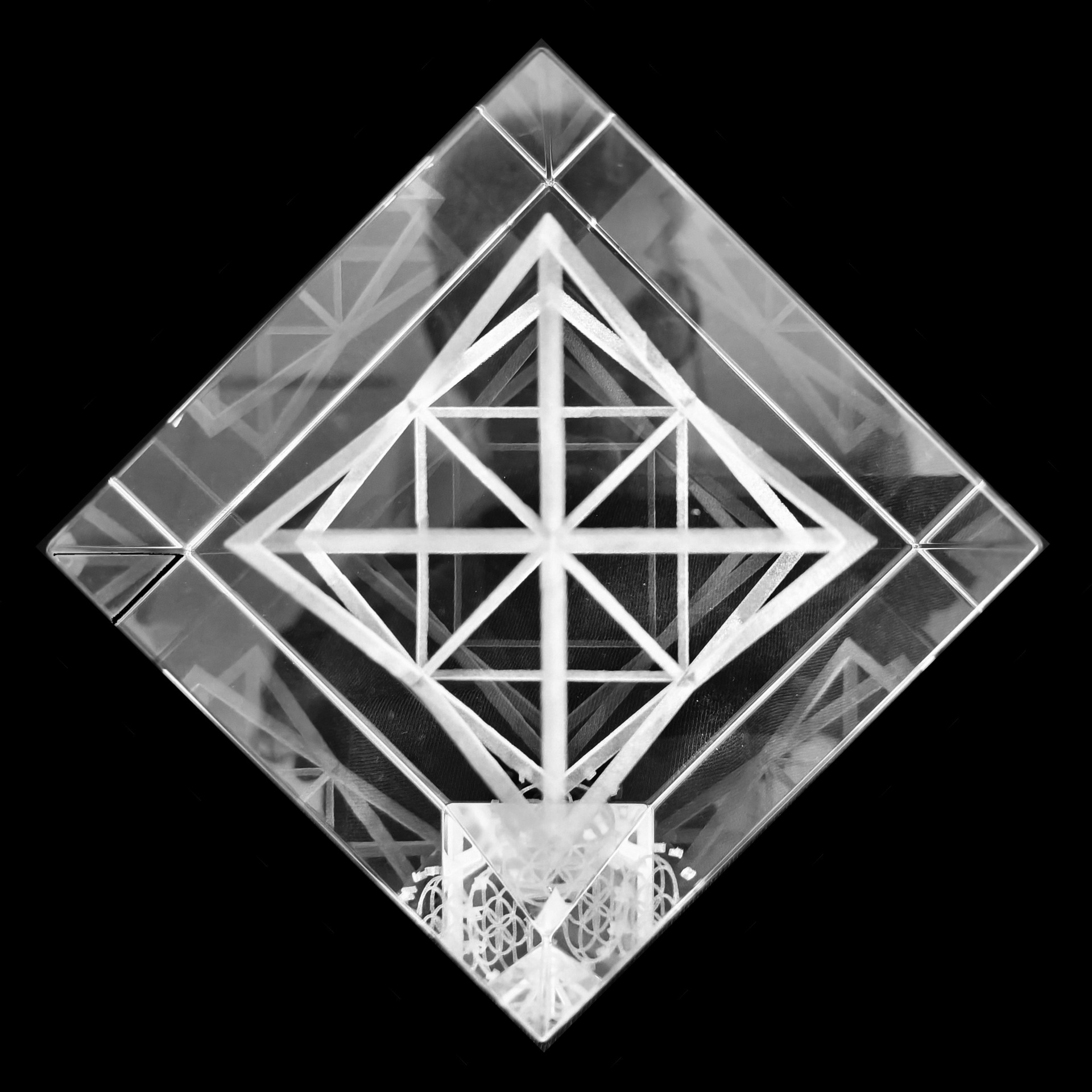 A luminous and mysteriously reflecting Merkaba inside a 9 cm x 9 cm x 9 cm cube. As if standing on the edge.
