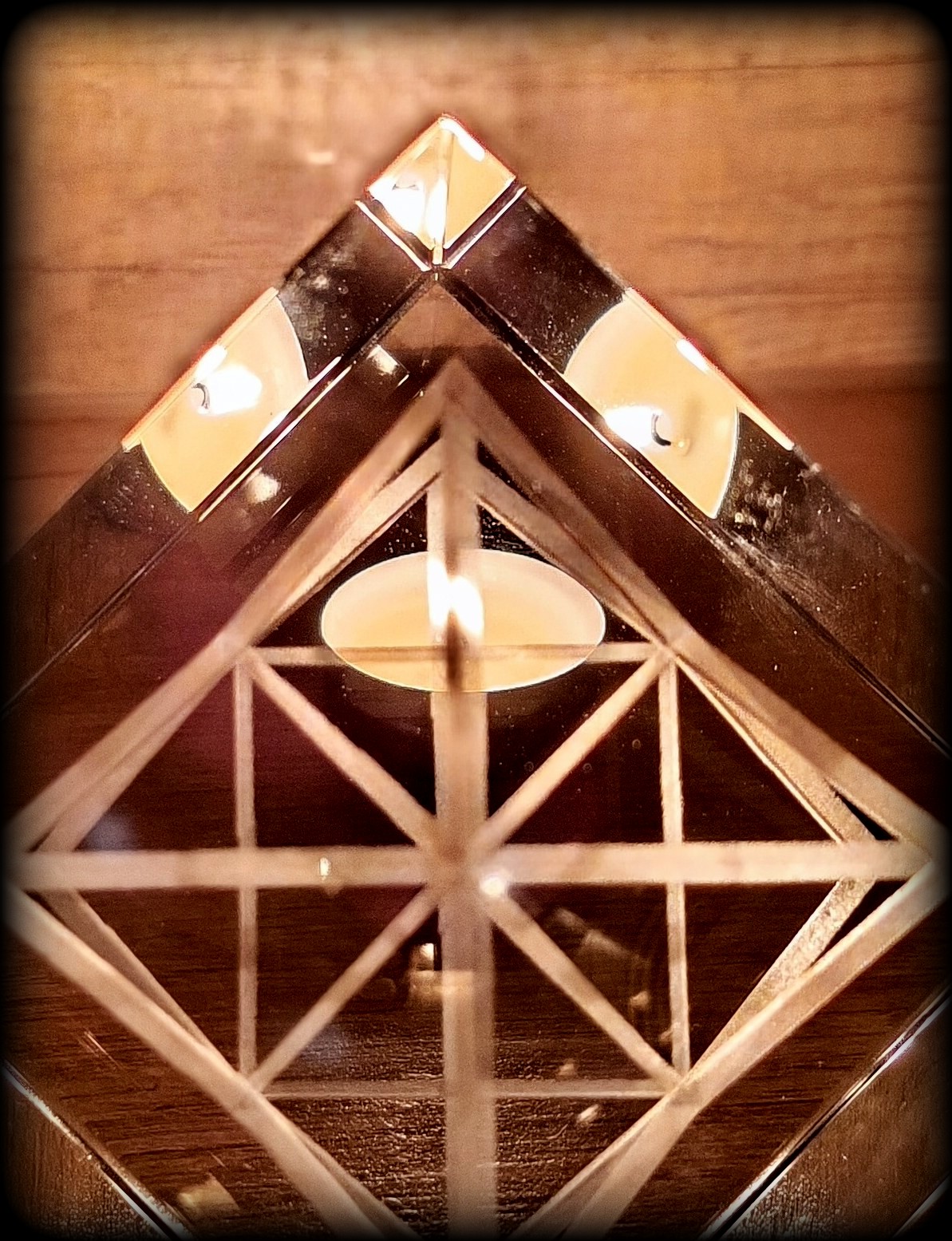 Merkaba a čajová svíčka. Záleží na úhlu pohledu, co si chceme z nabídky světelné hry právě vybrat.