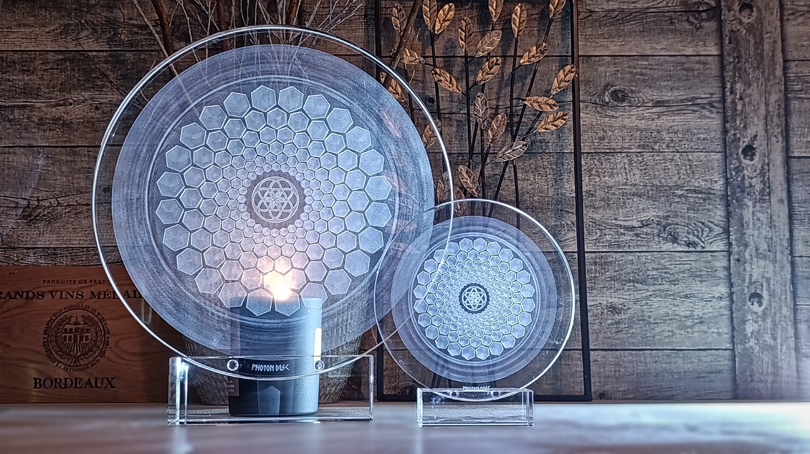 Úžasné zkušenosti s účinky Flow Disců postupně vykrystalizovaly také do vývoje Fotonového Discu, tedy takového Discu, jehož informační matrice se zapisuje do světelného fotonového toku. Nosným médiem* byl zvolen speciální drahý materiál, super čistý křemík (SiO2) s čistotou vyšší než 99,99% ! jež je dokonalým světlovodičem a který má klíčovou schopnost zapisovat informace a pracovat s nimi (např. vesmírné dalekohledy, křemíkové PC chipy). Uvnitř se nachází speciálně upravená 3D struktura Flow Discu pro ideální působení v optickém spektru. A jako vždy, jde o kvalitu informací. Tvar 3D struktury v sobě obsahuje kódy: Posvátné Geometrie, Kosmických konstant a Zákonů Přírody. Tvary Fotonového Discu obsahují obrovské množství přesně nastavených plošek pod různými úhly. Odražené fotony světelného toku po interakci s informační matricí Fotonového Discu následně zaplavují okolní prostor. Živé buňky nacházející se v tomto prostoru si mohou načítat informace a mohou čerpat z životadárnosti informačního světelného pole Posvátné Geometrie.